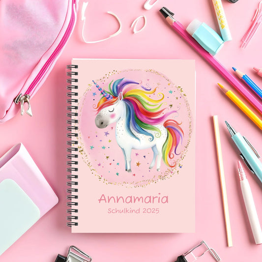Personalisierter Collegeblock für Kinder- Einhorn - Hausaufgabenheft - Schulbeginn - Geschenk Einschulung
