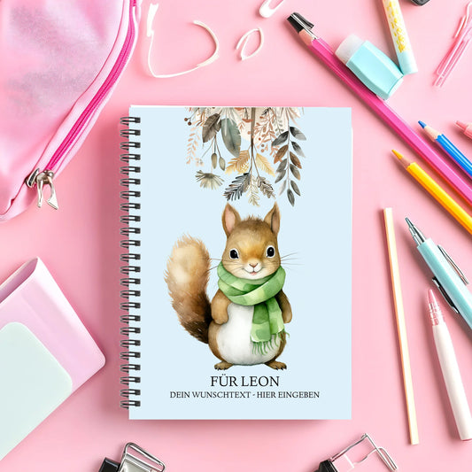 Personalisierter Collegeblock für Kinder - Hausaufgabenheft - Schulbeginn - Geschenk Einschulung Eichhörnchen