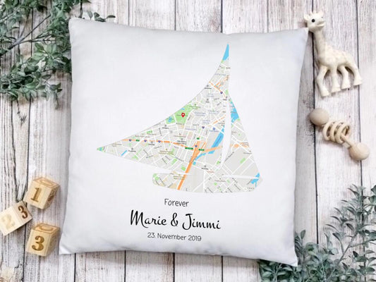 Hochzeitsgeschenk Segelschiff Personalisiertes Kissen im Landkarten Style, Geschenk zur Hochzeit, Valentin, Hochzeitstag
