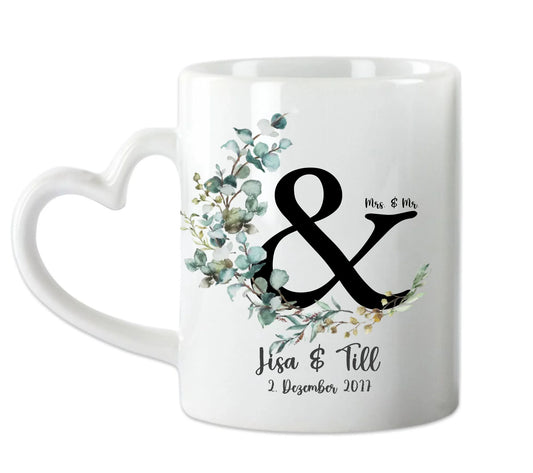 Personalisierte Hochzeitstasse Hochzeitsgeschenk Blumenkranz Herz Brautpaar, Kaffeebecher - Geschenk Hochzeit