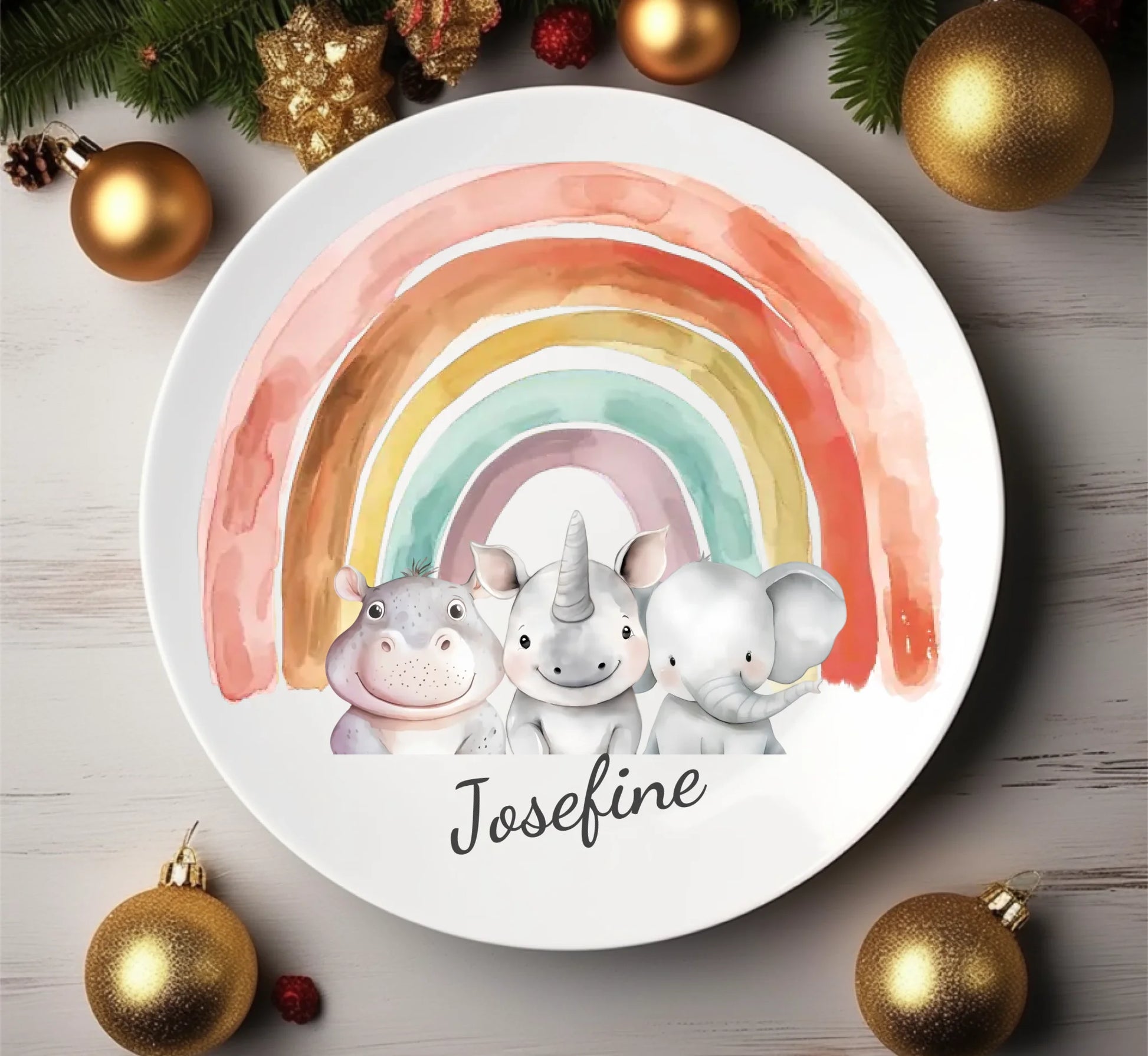Kinderteller Regenbogen mit Namen & Safari-Dschungeltieren personalisiert, Kindergeschirr Geschenk zur Taufe, Geburt, Geburtstag und Weihnachten
