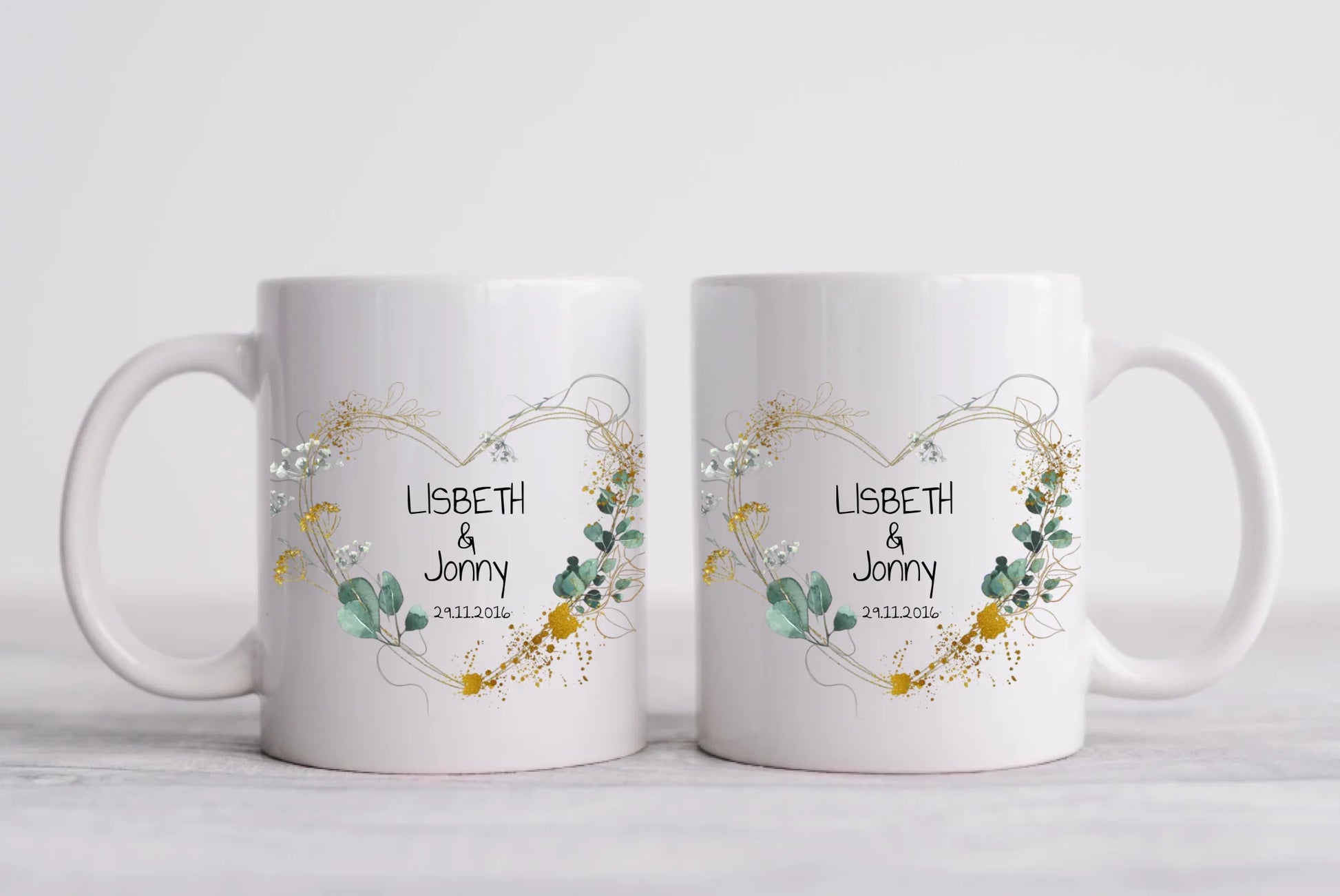 Personalisierte Hochzeitstasse Hochzeitsgeschenk Blumenkranz Herz Brautpaar, Kaffeebecher - Geschenk Hochzeit