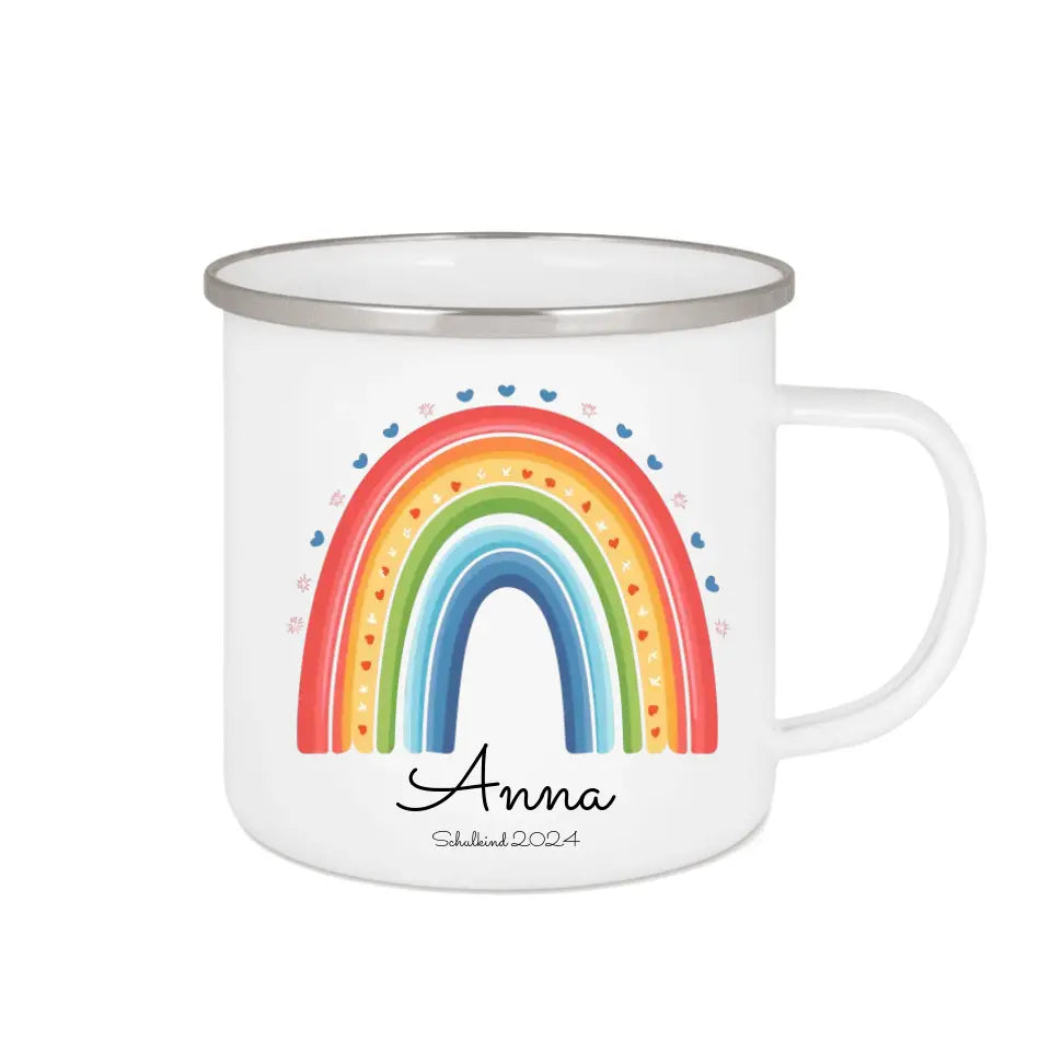 Schulanfang Kindertasse Schulkind 2024 - Emaille Kinderbecher Einschulung Regenbogen mit Namen personalisiert - Einschulungsgeschenk