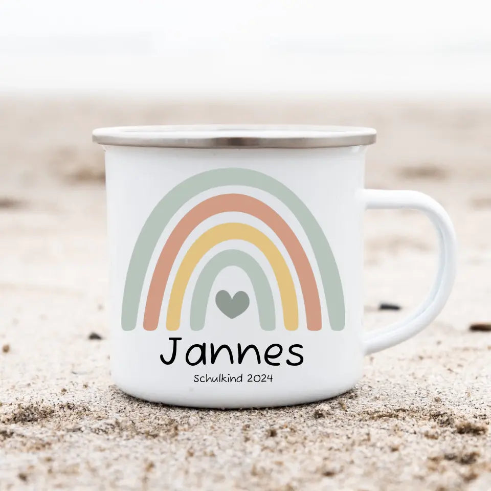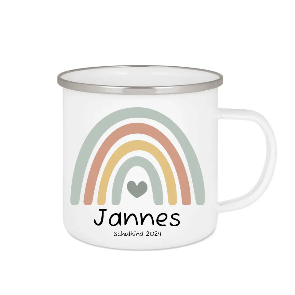 Schulanfang Kindertasse Schulkind 2024 - Emaille Kinderbecher Regenbogen Einschulung mit Namen personalisiert - Einschulungsgeschenk