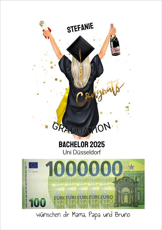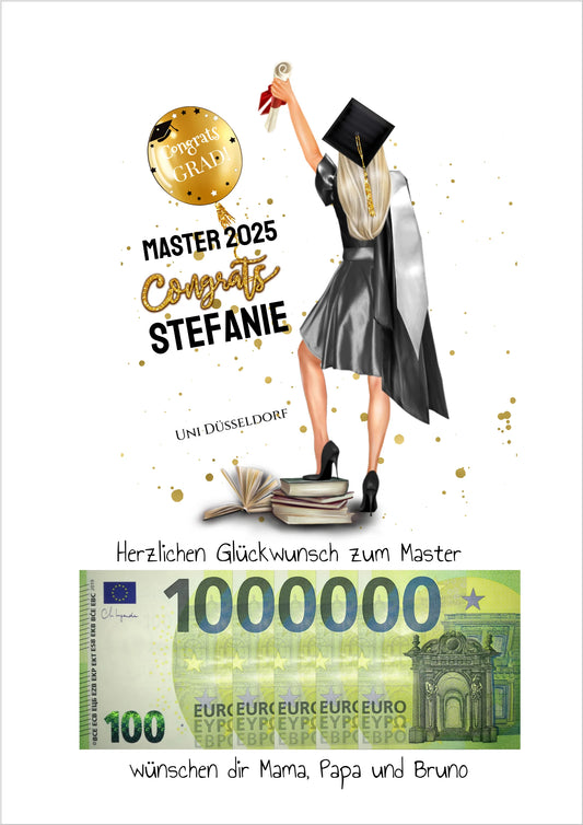 Geldgeschenk Wunscherfüller - Personalisiertes Abschlußgeschenk zum Abi, Bachelor, Master, Doktor - 1. Million - Frau