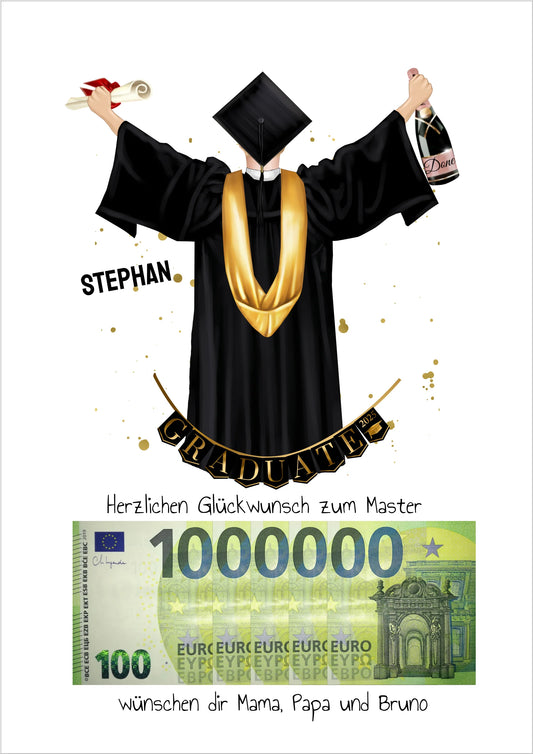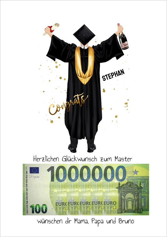 Geldgeschenk Wunscherfüller - Personalisiertes Abschlußgeschenk zum Abi, Bachelor, Master, Doktor Mann - 1. Million