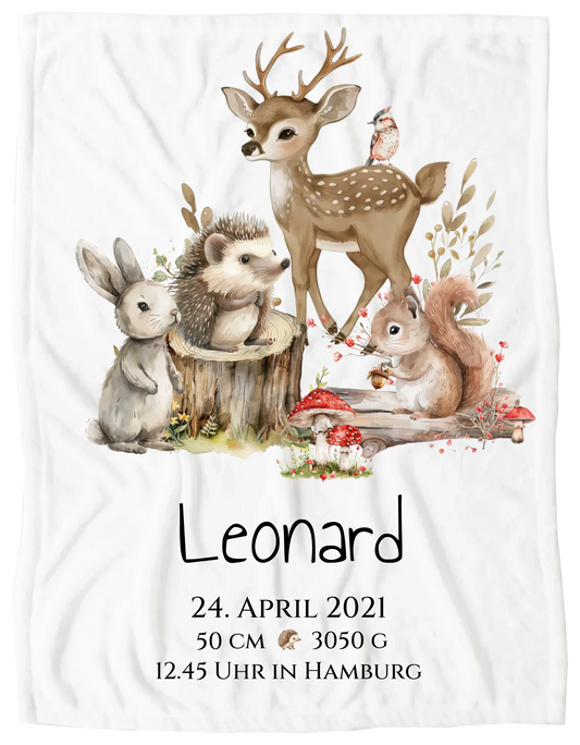 Personalisierte Kinderdecke Geschenk zur Geburt und Taufe | Waldtiere Kissen & Kinderposter