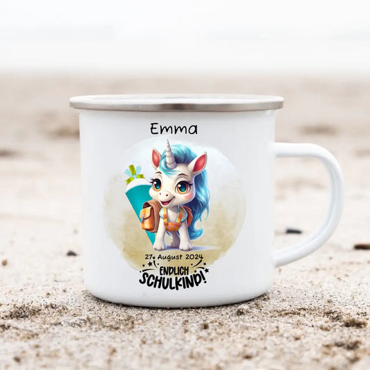 Schulanfang Kindertasse Schulkind 2024 - Emaille Kinderbecher Einhorn Einschulung mit Namen personalisiert - Geburtstagsgeschenke