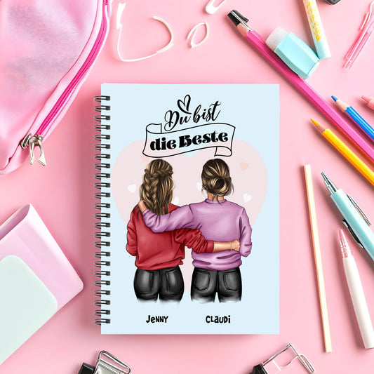 Personalisierter Collegeblock für Mädchen, 2 beste Freundinnen mit Namen und Spruch für Schule, Studium, Geburtstag