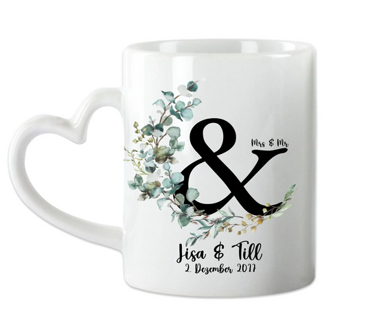 Personalisierte Hochzeitstasse Hochzeitsgeschenk Blumenkranz Herz Brautpaar, Kaffeebecher - Geschenk Hochzeit