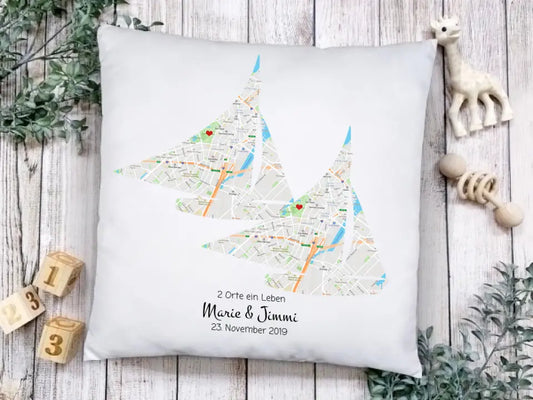 2 Orte ein Herz Hochzeitsgeschenk Segelschiff Personalisiertes Hochzeitskissen im Landkarten Style