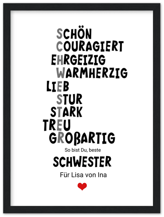Ein stilvolles Poster mit der Definition von "Schwester" oder "Bruder", das an der Wand hängt, kann eine tägliche Erinnerung an die besondere Bindung zwischen Geschwistern sein. Diese Drucke können in verschiedenen Größen und Designs angepasst werden, um perfekt in das Zuhause des Beschenkten zu passen.