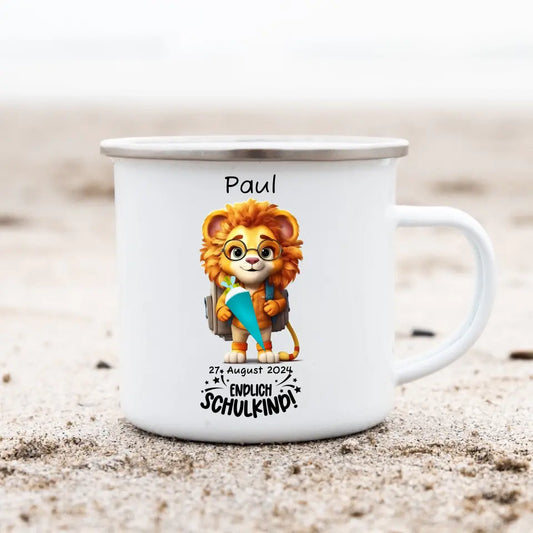 Schulanfang Kindertasse Schulkind 2024 - Emaille Kinderbecher Löwe Einschulung mit Namen personalisiert - Geburtstagsgeschenke