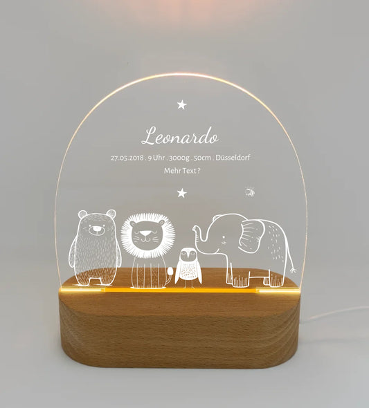 Personalisiertes Baby & Kinder LED Nachtlicht Safari Tiere mit Namen & Geburtsdaten Geburtsgeschenk & Taufgeschenk