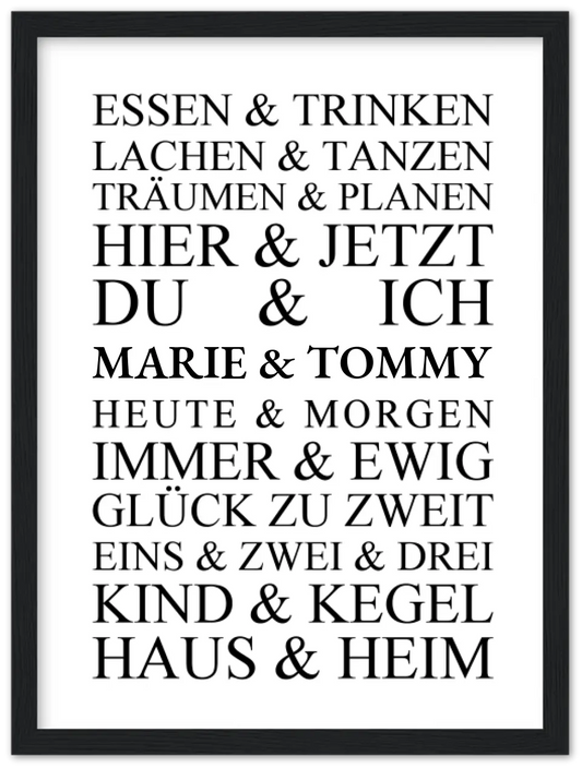 Beginnen Sie, indem Sie Ihre Namen auf das Poster setzen. Dies macht Ihr Kunstwerk sofort persönlich und zu einem wertvollen Andenken.