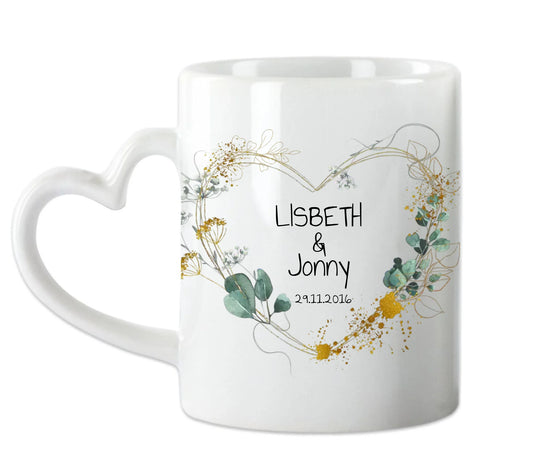 Personalisierte Hochzeitstasse Hochzeitsgeschenk Blumenkranz Herz Brautpaar, Kaffeebecher - Geschenk Hochzeit
