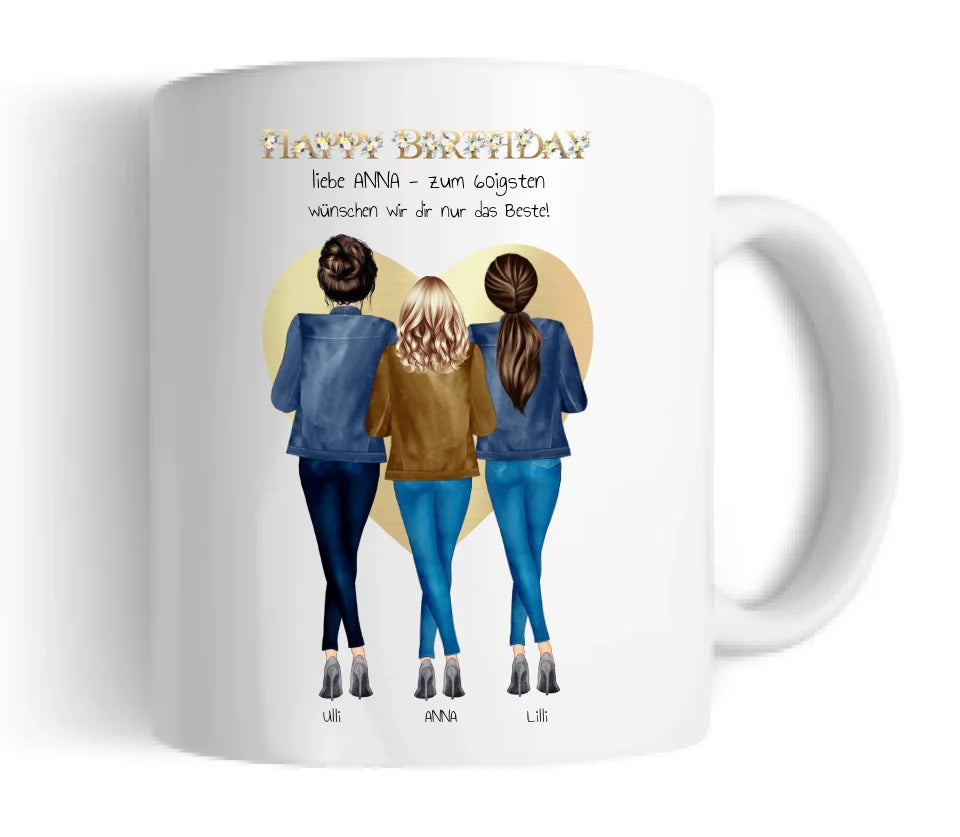 60 Geburtstag Freundin Geschenk | Personalisiertes Tasse Happy Birthday mit 3 Freundinnen | Geschenk Schwester | Kollegin | Mama