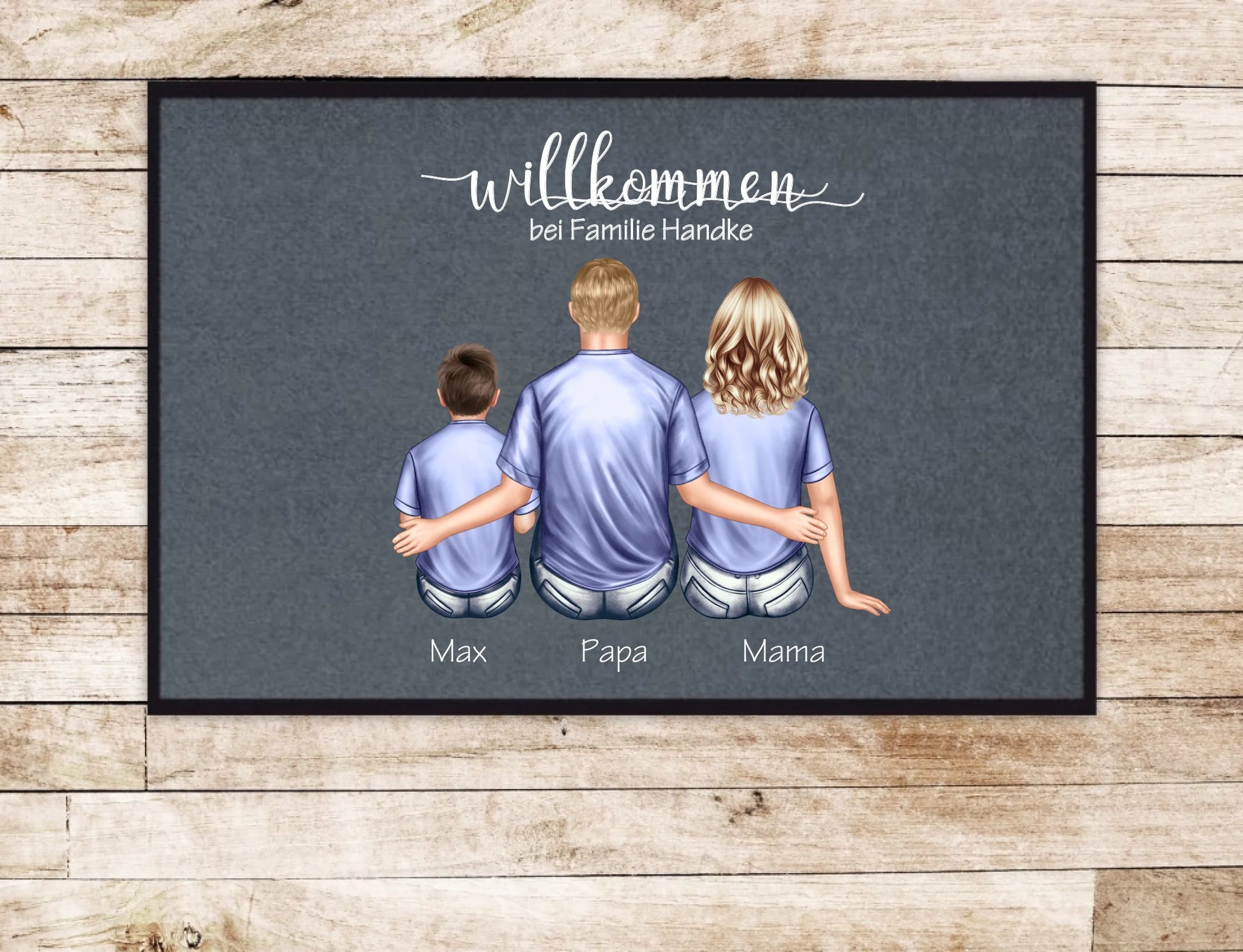 Personalisierte Familien Fußmatte mit Gummirand mit 1-5 Personen Motiv, Wunschtext und Namen gestaltbar.