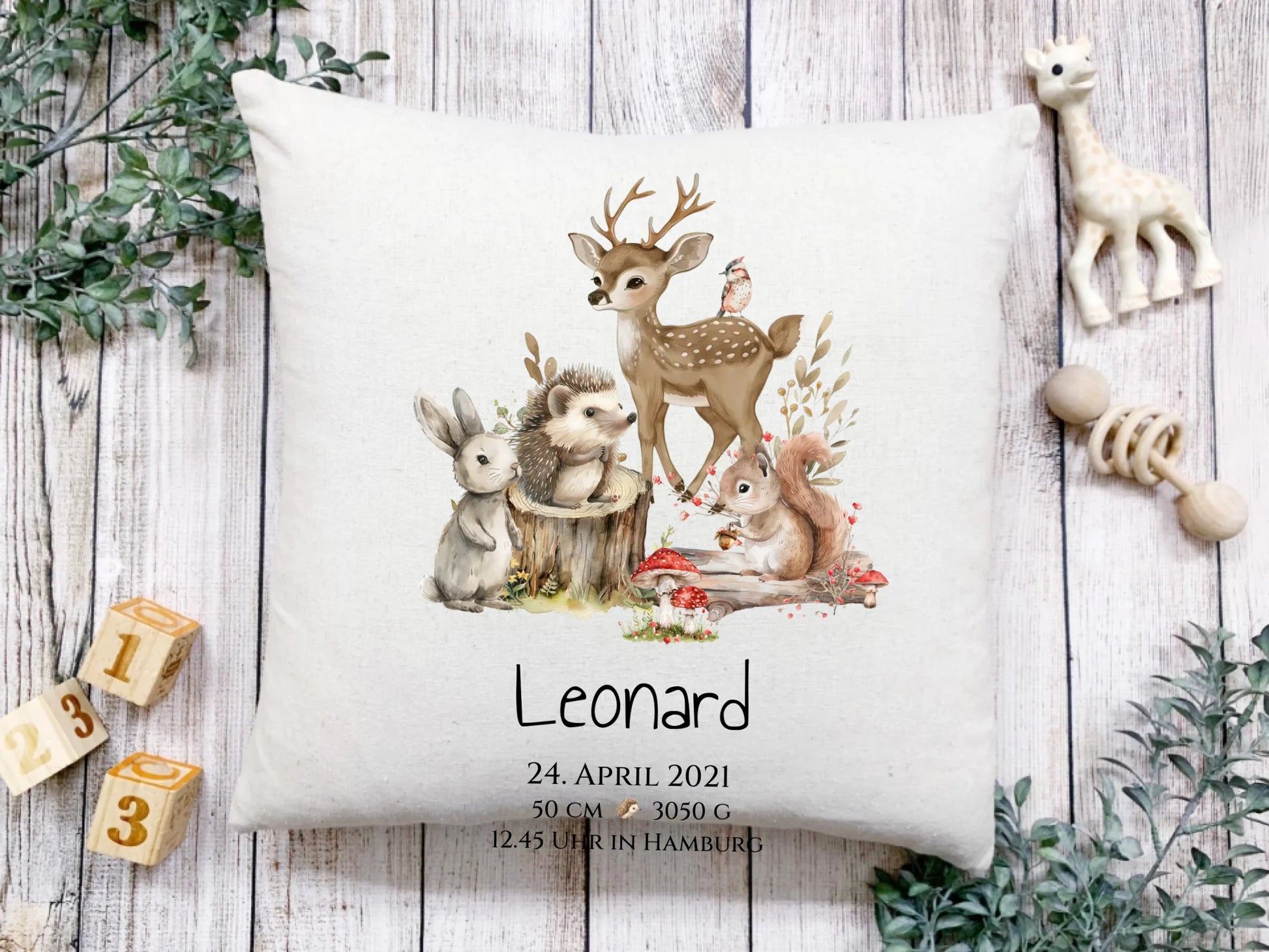 Personalisierte Kinderdecke Geschenk zur Geburt und Taufe | Waldtiere Kissen & Kinderposter