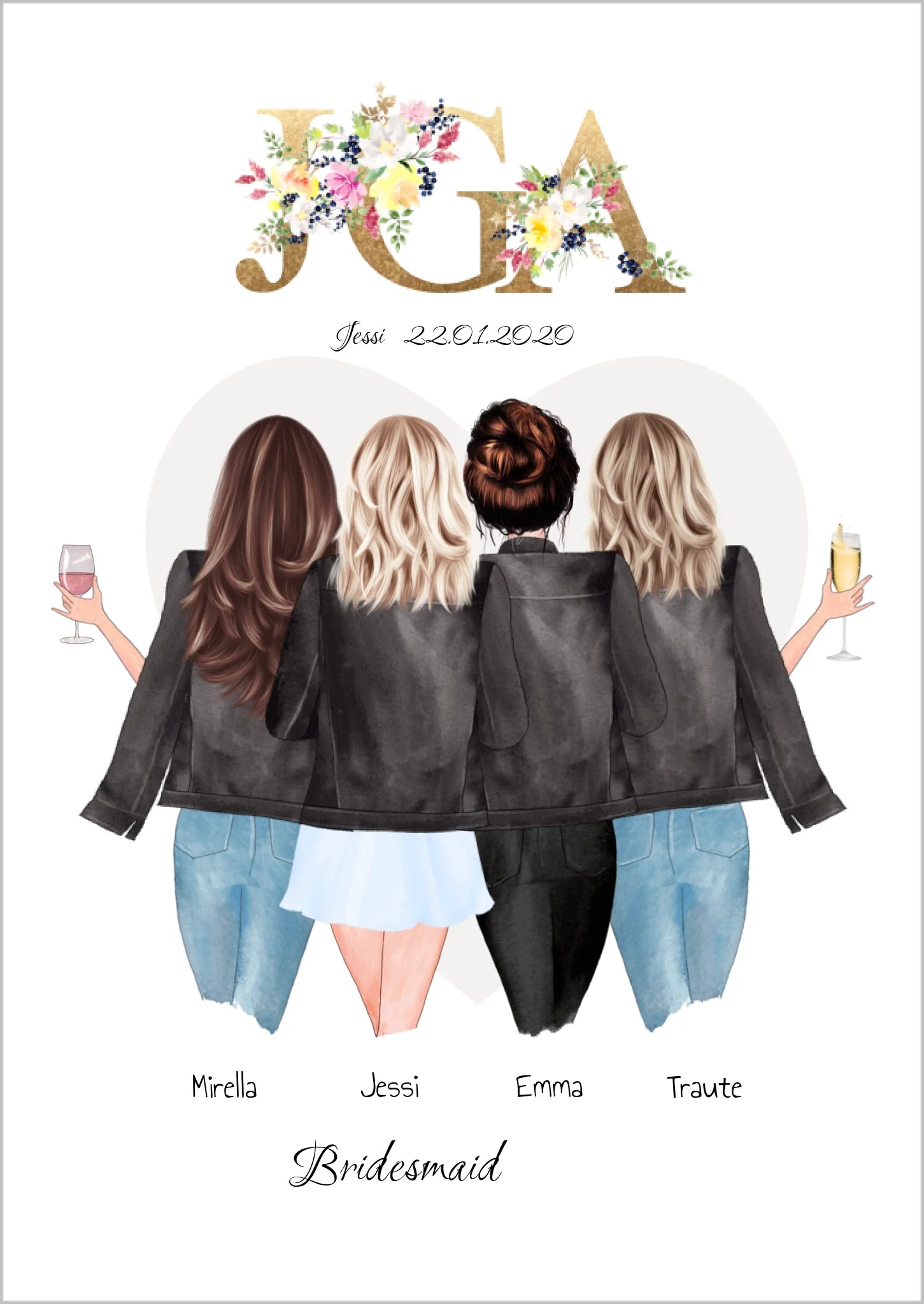 Personalisiertes Geschenk JGA Poster, Junggesellinnenabschied Freundin, Team Braut, Bridesmaids, Braut Geschenk 4 Freundinnen