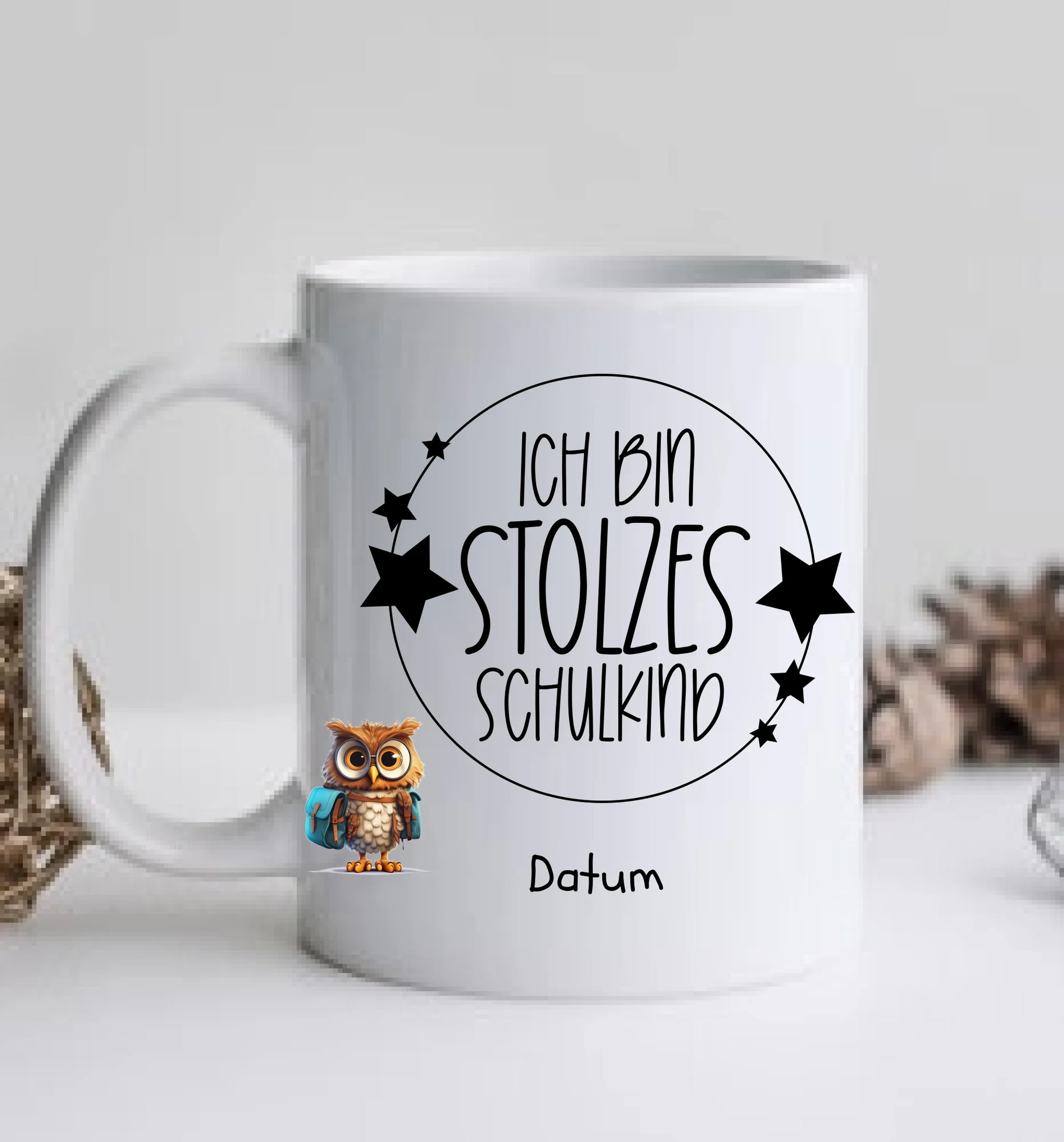 Schulkind 2024 | Einschulung Geschenk Kinder Tasse Becher Kissen Eule personalisiert | Einschulungsgeschenk | Schulbeginn 1. Klasse