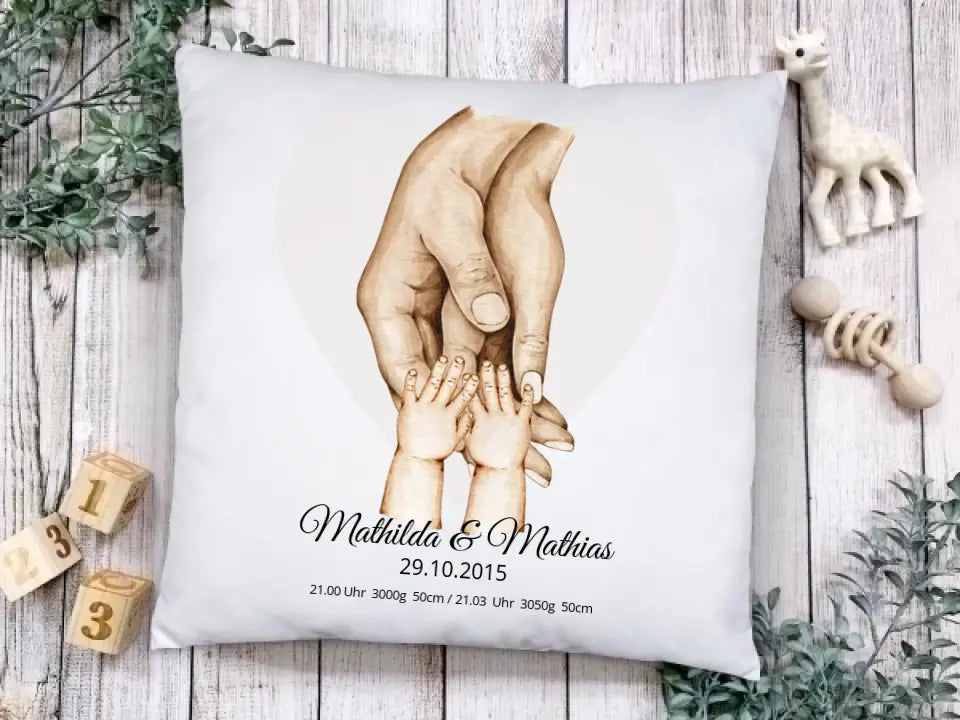 Geburtsgeschenk & Taufgeschenk Babykissen Zwillinge personalisiert zur Geburt & Taufe mit Namen und Geburtsdaten | Hände Motiv